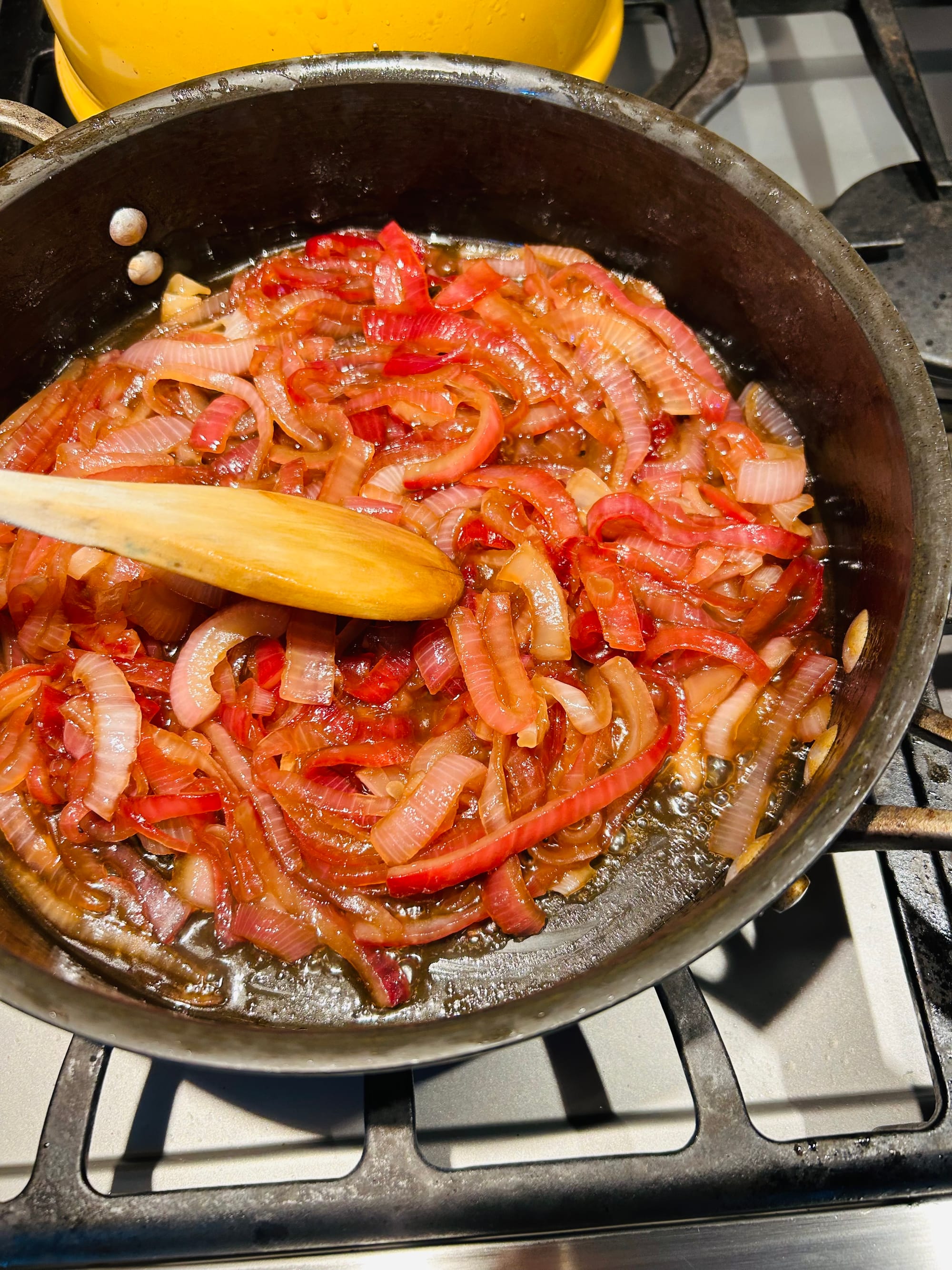 2. Cook uncovered over medium high heat for about 15 minutes. Stir occasionally until the onions are almost dry and the onions are somewhat softened, not ’jammy’ soft.