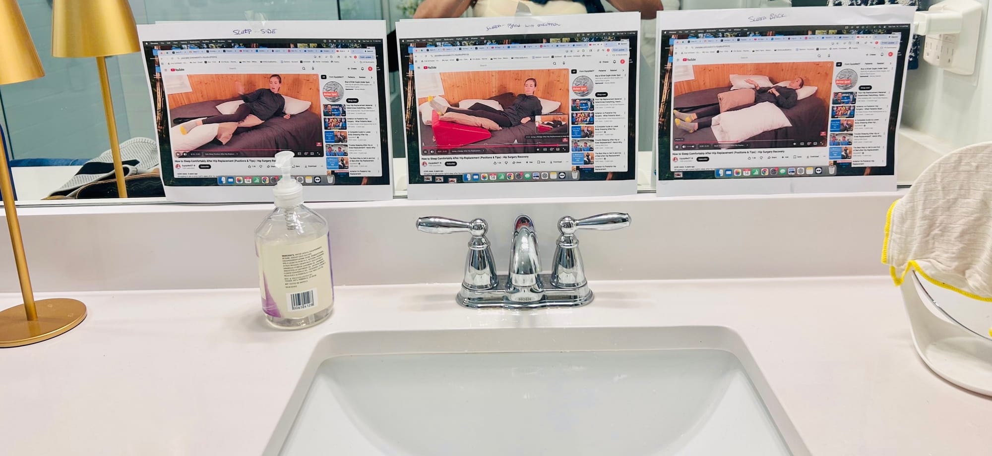 We made preparations for the first hip replacement surgery, preparing food in advance, printed out sleeping positions, rolled up the rug, got a walker, crutches, etc. WE were ready…Last photo on the lower right, me when I came home from the first surgery, good attitude and optimistic about the outcome…
