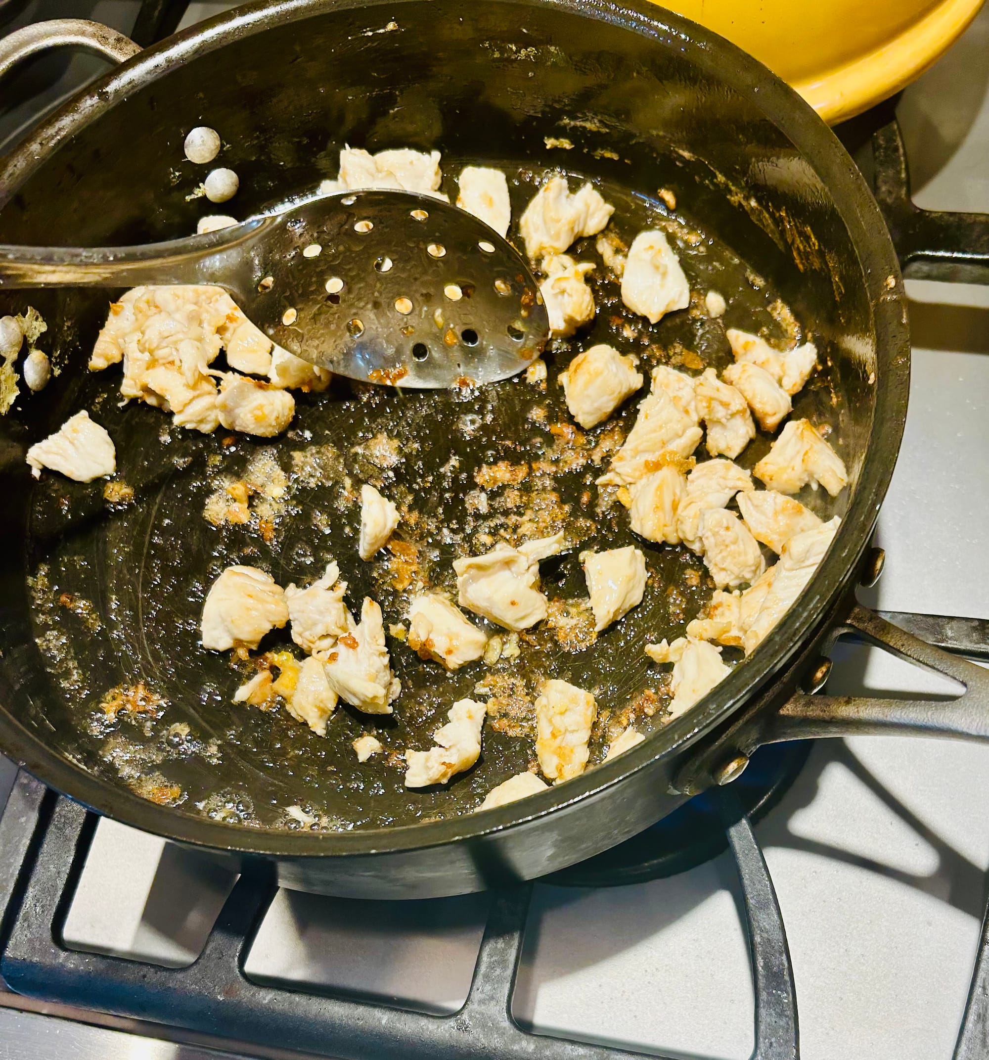 3. Add the remaining 2 teaspoons of avocado oil and the chicken. Cook, stirring until the chicken is almost cooked through (about 2 minutes). Add 1 Tablespoon of the Soy sauce and stir to combine.