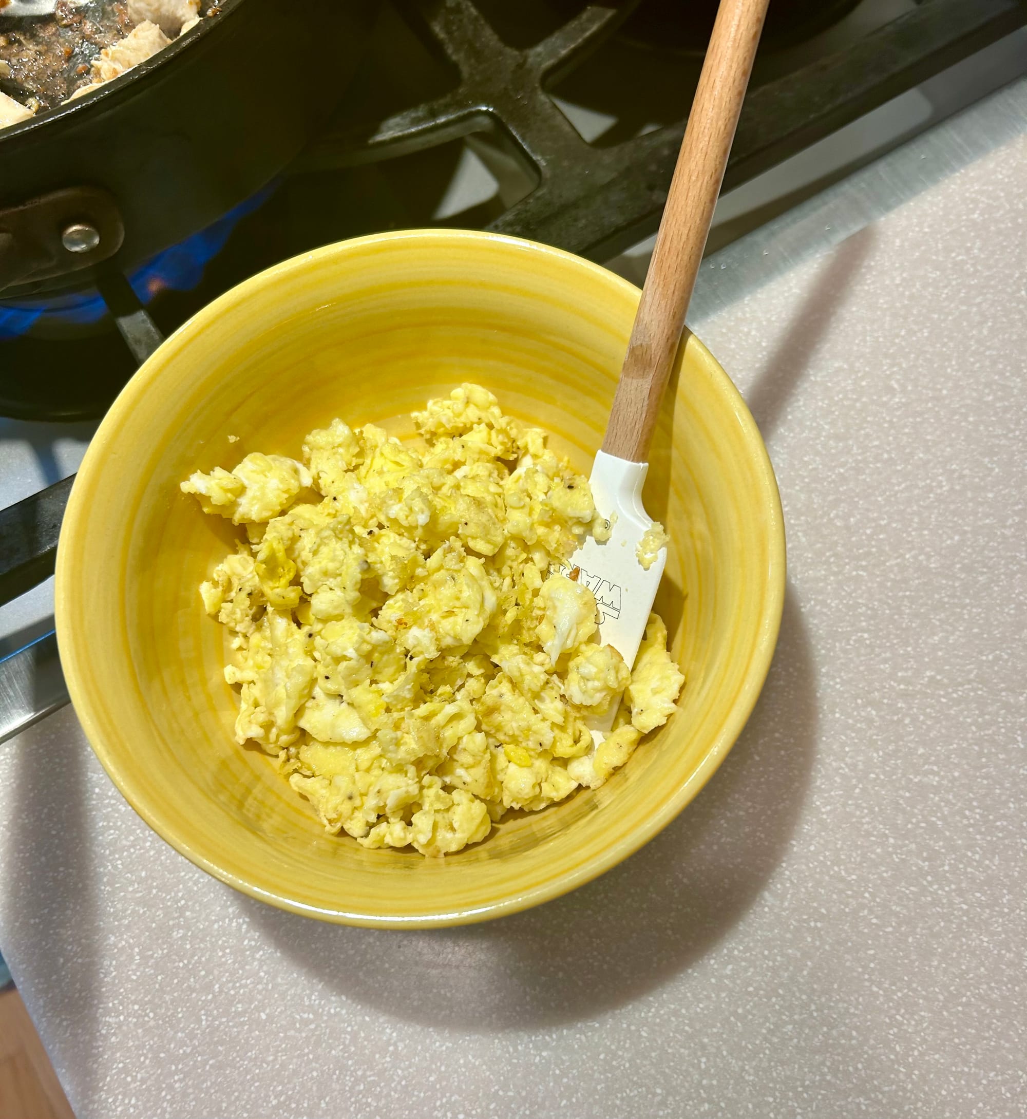 -4 eggs (seasoned with a little black pepper and salt when scrambling)