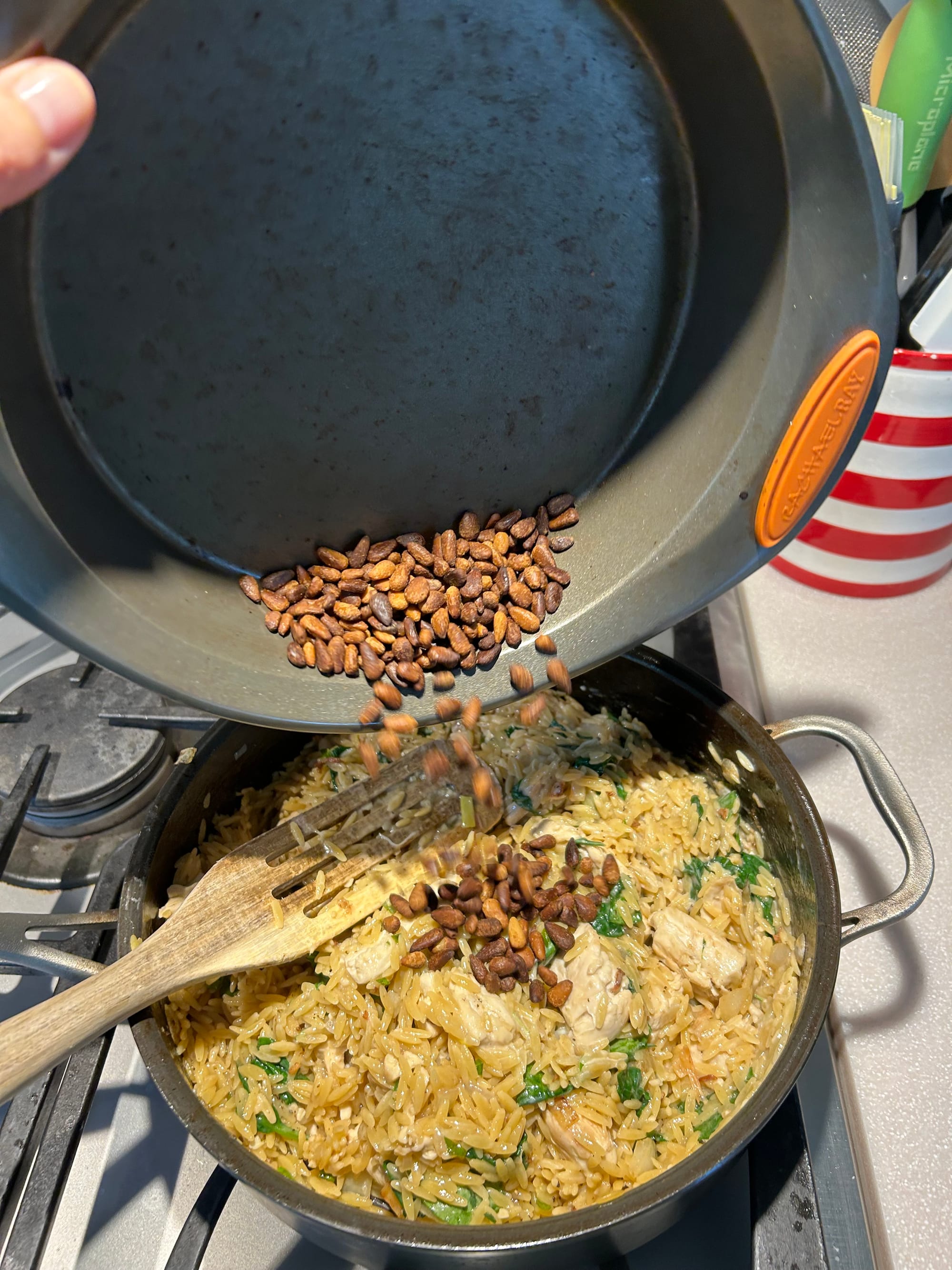- Add a tablespoon of olive oil to the warm pan. Add the orzo, stirring briskly to toast it lightly and fully coat the orzo with the oil. Add the white wine to deglaze the pan, scraping up any delicious brown bits that are on the bottom of the pan from cooking the chicken. Allow nearly all of the wine to evaporate from the pan. Add the garlic and cook an additional minute.