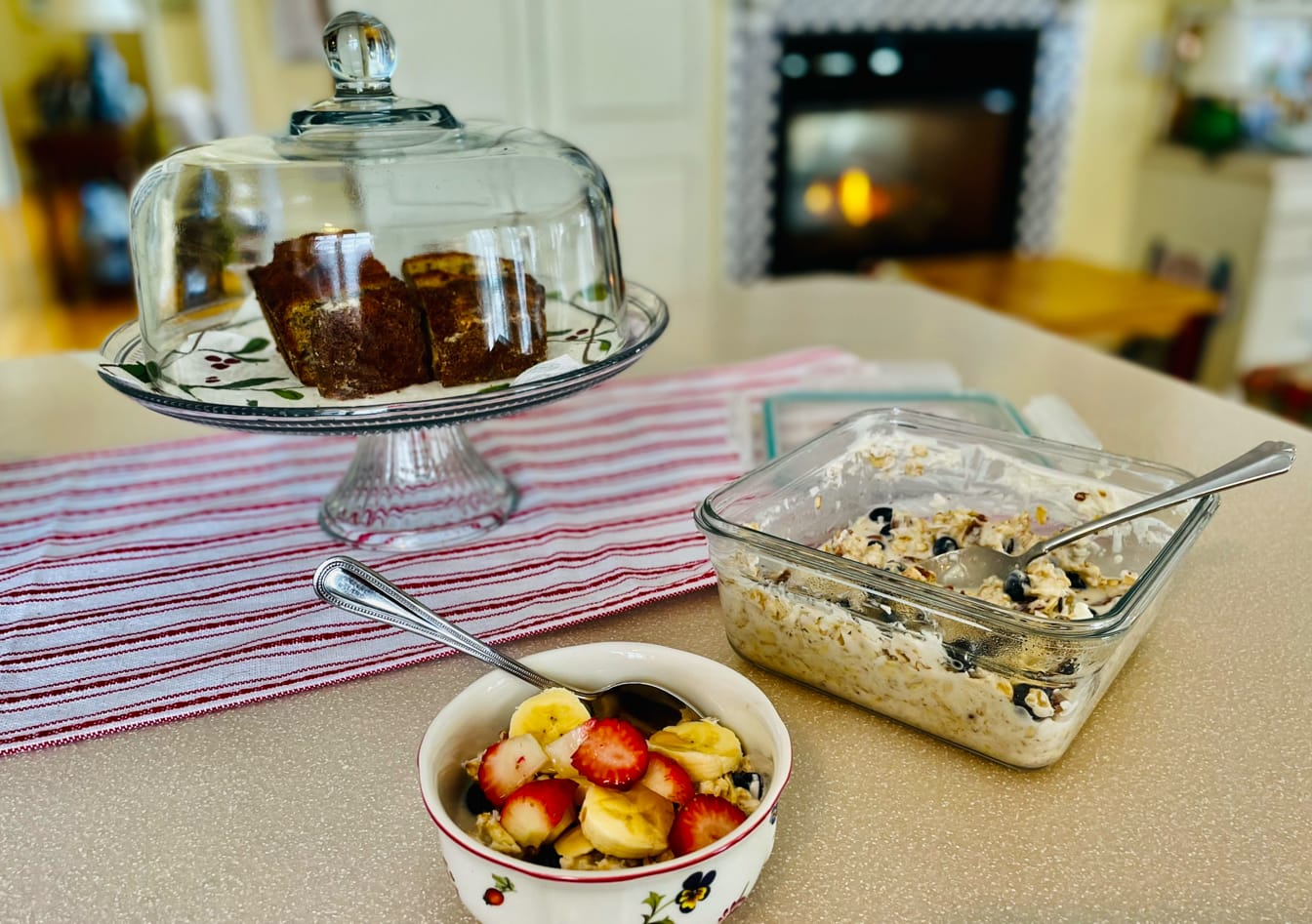 WELL, fear no more. Itās all here. These recipes are simple and may even become part of your kitchen repertoire. I like to have a salad on hand, like my Green and White Egg Salad, an easy nutritious soup or stew, my very quick and easy Zucchini Soup, cookies either YOUR Favorite Christmas cookies and a few things like a good whole grain bread from your bakery or homemade for Avocado Toast and sandwiches, so add avocados, sandwich meat & cheese, fruit and cottage cheese to this list so guests can āHelp Themselves.ā the Egg Salad and Soup recipe are below to refer to, or you may have your own recipes for a good salad and soup to have on hand and these are just thought and ideas to get you going. Also, my Orange Pancakes (which can be made in advanced and kept in the freezer or fridge to re-heat in the toaster as needed-never the microwave) or mix up the dry ingredients in advance, keep in an airtight container and add wet ingredients when you make them-recipe on my website(I am not a pancake person and I love these. Bircher-Muesli(below)and Protein Balls (also on my website here) which are all three always a hit. If you donāt have time to make cookies, pick some up. For a snack or simple breakfast this week, consider the Bircher-Muesli served with fruit and boiled eggs. Lu or Pepperidge Farm cookies are always good. Just put them on a platter lined with doilies and most grocery store bakeries have some specialty cookies like chocolate no-bakes or Russian Tea Cakes also known as Mexican Wedding Cookies. If you happen to be the guest, offer to help out as much as possible, emptying the dishwasher, setting the table or cleaning up, and take your sheets and towels to the laundry room on the day of your departure. Be a good guest. Always. To make things easier for yourself the host or hostess, enlist the help of your children or guests and it is NEVER a ācop outā to have anything catered or pick up food at your favorite restaurant, just decide to do that in plenty of time and NOT last minute-restaurants may or may not be able to help with last minute orders, they have groceries to order and staff to have to prepare. Ok, I think youāre all set. Remember, guest or host, the food is ALWAYS secondary to those around the table. ALWAYS. Keep it simple, make your lists each day and try to enjoy and make each and every dayā¦listening to nice Christmas helpsā¦