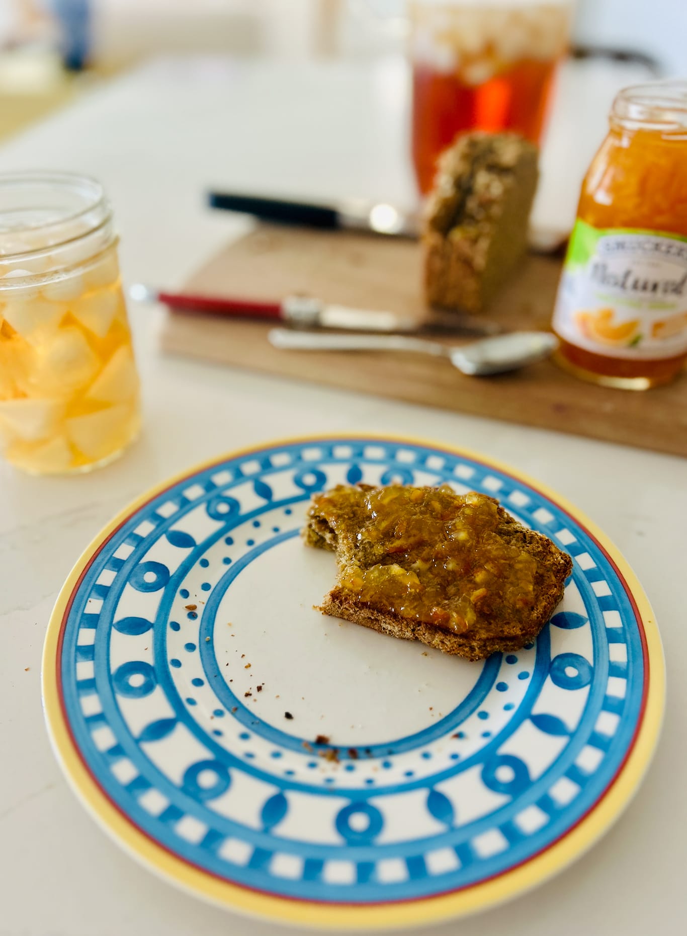 Back to the bread. The first time I made this, I thought, “this looks like a mess.” Boy was I wrong. Upon completion and cooling, I tried a slice with unsalted butter and orange marmalade. The recipe makes two loaves. I slice both loaves and put them in a freezer bag to make pulling out a slice at a time to toast. Consider a slice a perfect afternoon snack with smashed avocado. Here you go!