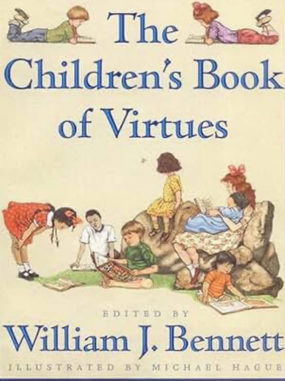 When we were raising our children, we began with a little board book of children’s Bible stories. The Bible is always the best place to start and it was so worn the pages came apart. Each of our children had their own and it was placed into their “special boxes” to take when they left our home. Our kids loved hearing about Noah, Adam & Eve, Shadrach, Meshach and Abednego. As they grew into older kids we bought a more advanced version and eventually they got their own Living Bible. From there we read other classics to our children like Fairy Tales, the stories of Hans Christian Anderson, such as The Ugly Duckling, The Princess and the Pea and The Emperor’s New Clothes. Later, we read classic American Literature. There are many anthologies published that include selections of these classics, you may remember some of them from your college textbooks, I still have mine. William Bennett,