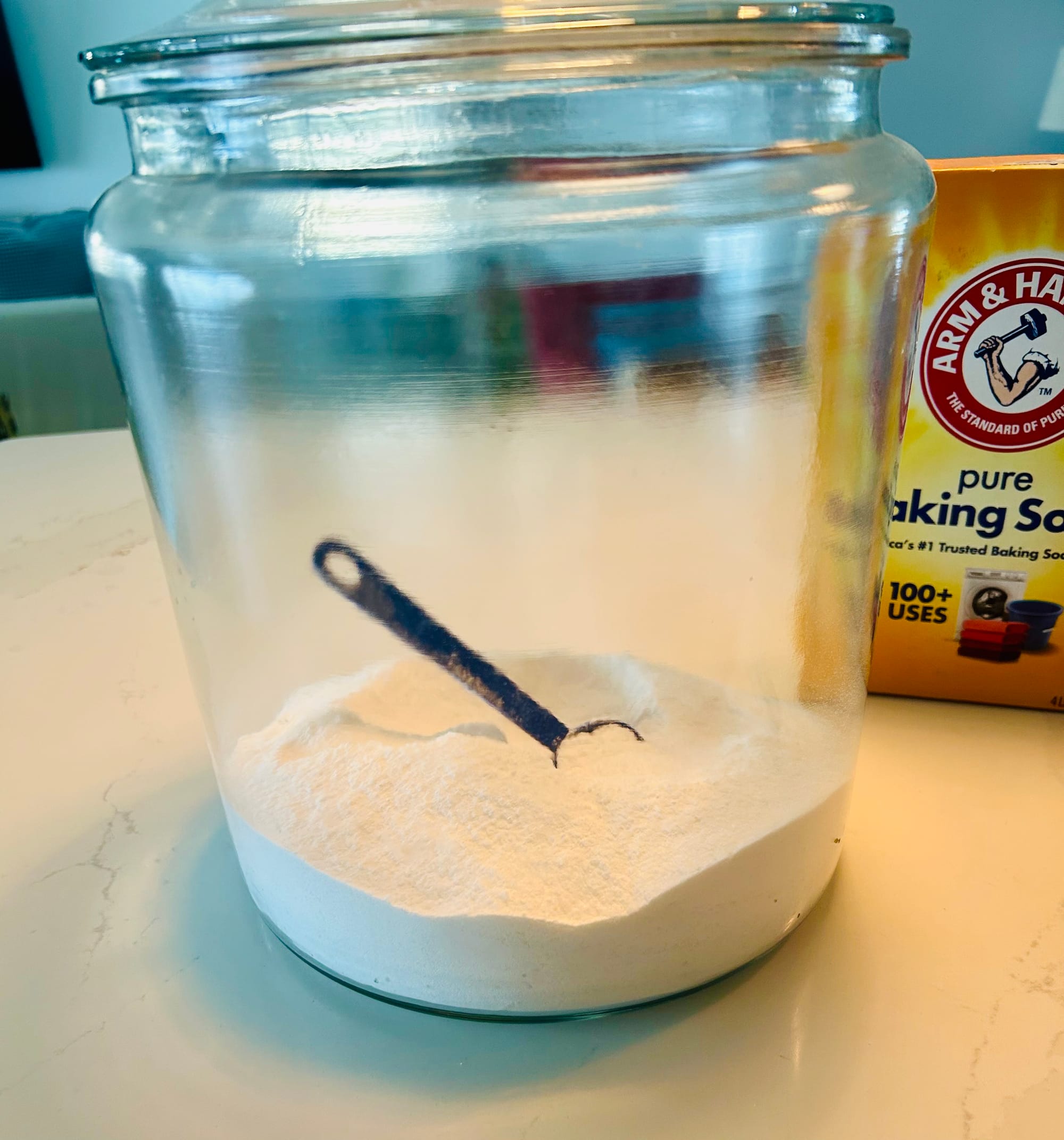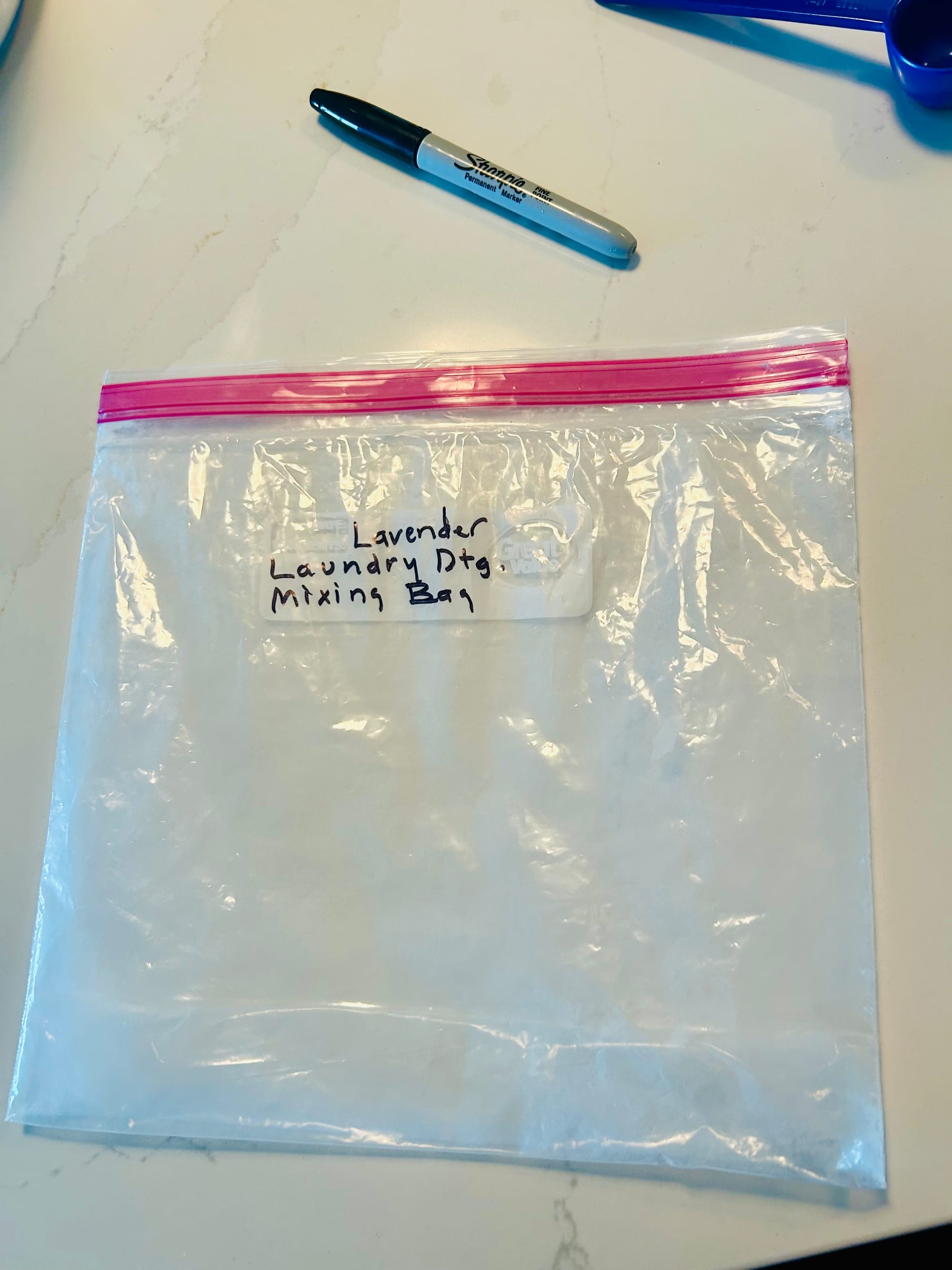 3. When ingredients are adequately blended, unzip bag and pour ingredients into a large glass jar or your favorite container with a Tablespoon for measuring out. You could also keep detergent in the large ziplock bag too.