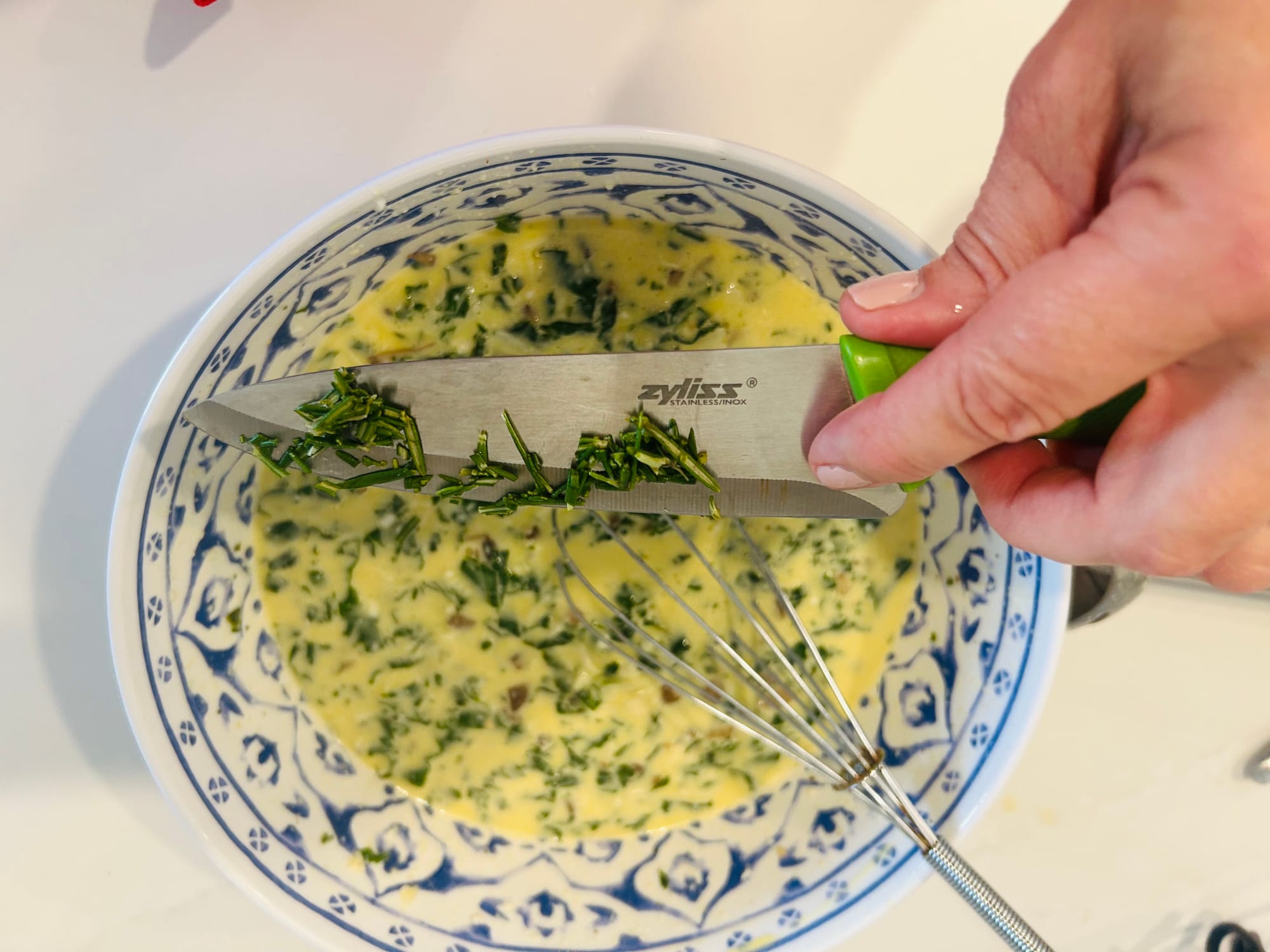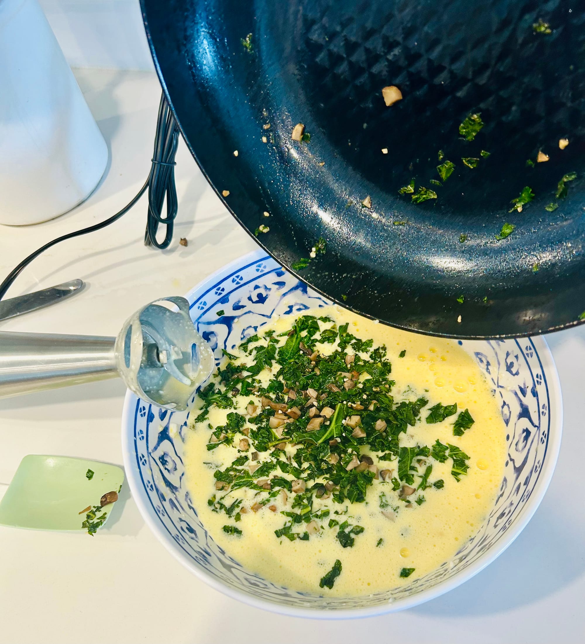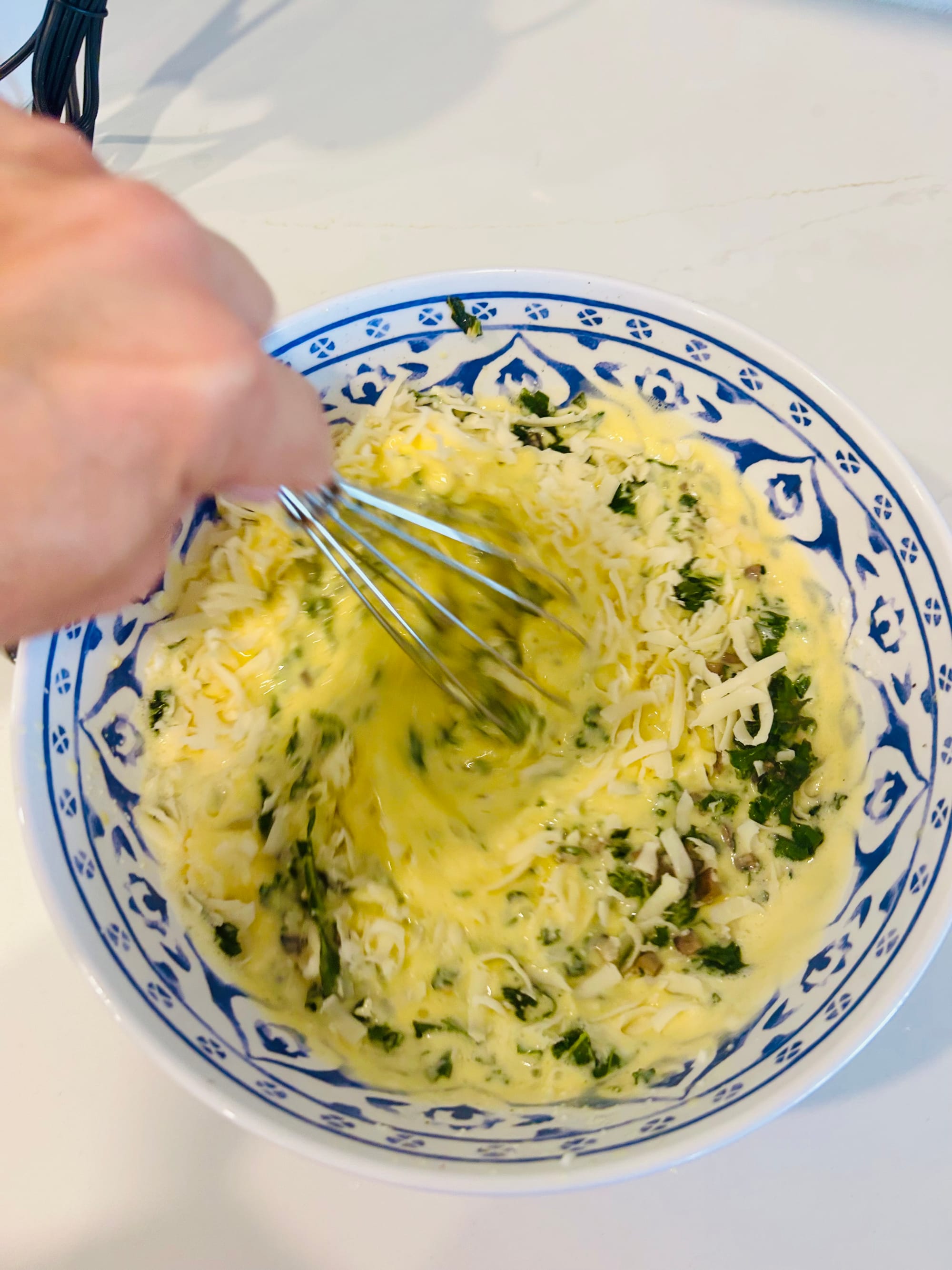3. Now make the egg mixture. In a large bowl, combine the eggs, cottage cheese, remaining 1/4 teaspoon salt, pepper & rosemary (or paprika). If you have an immersion blender or hand mixer, blend for about 15 seconds. (If you have neither, pour mixture into a regular blender.). After blending, fold in mushroom/kale cooked mixture and shredded cheese with either a whisk or spatula.