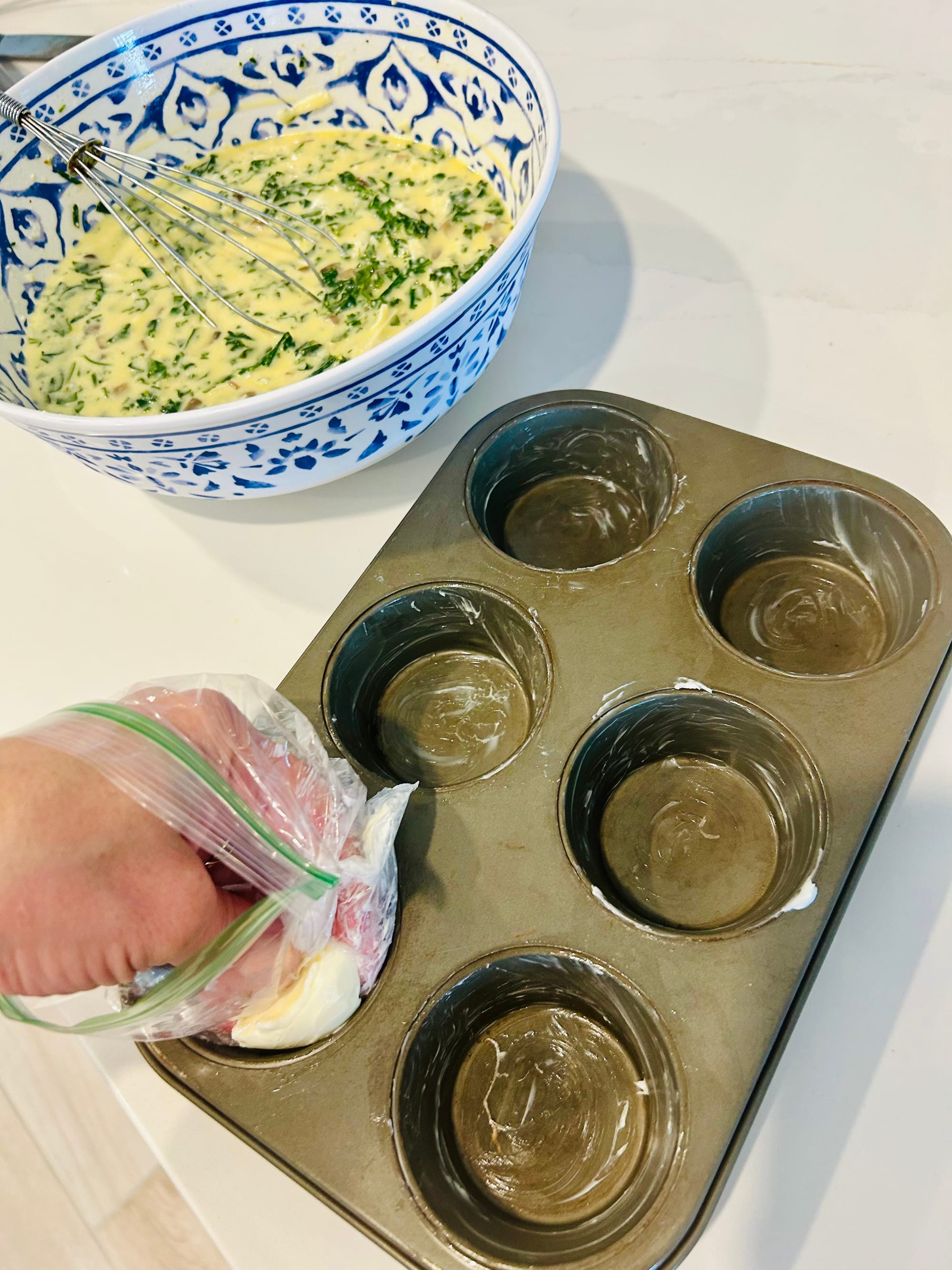 1. Preheat your oven to 350 degrees and coat 12 muffin tins with either olive oil or butter so as not to stick.