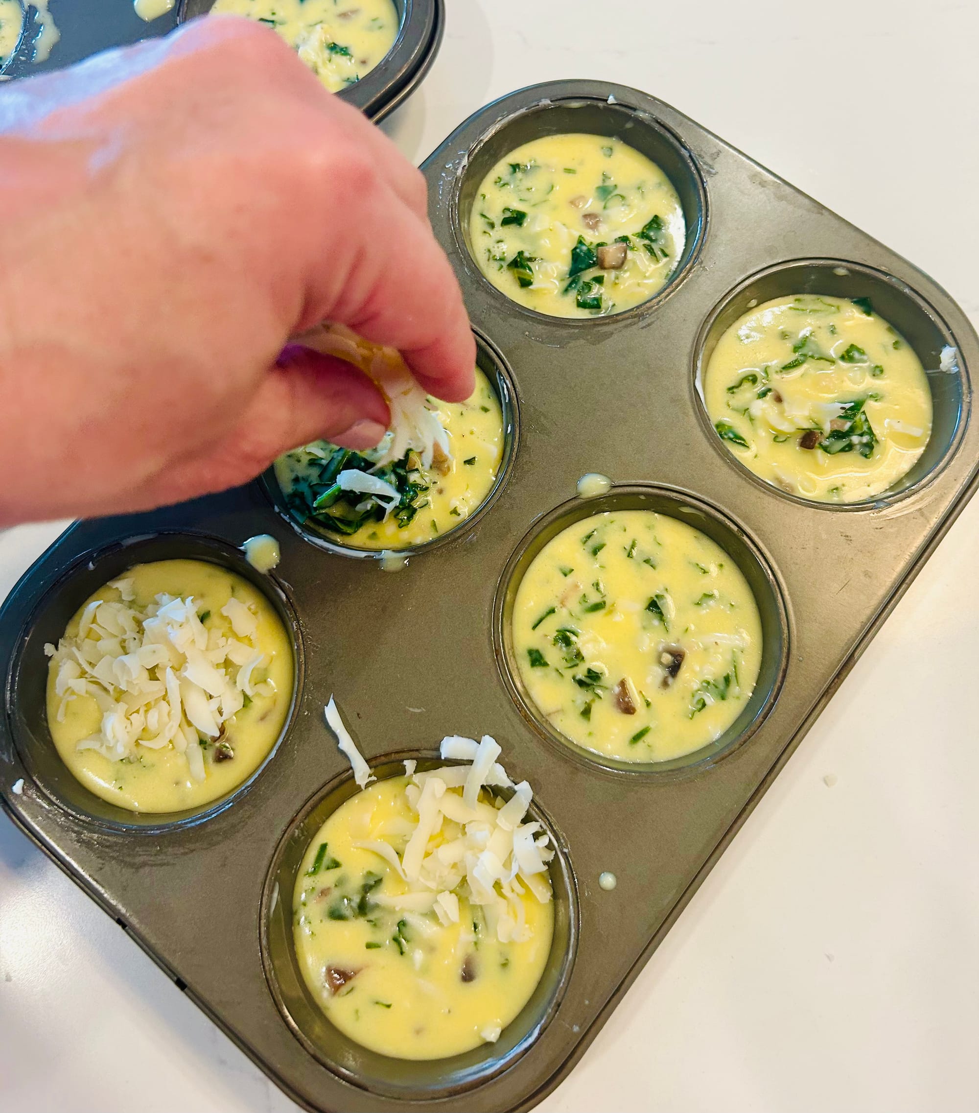 -1/2 cup Swiss cheese (you can substitute your favorite cheese (Monterey Jack). Reserve about 2 Tablespoons shredded cheese to sprinkle atop muffin tins.