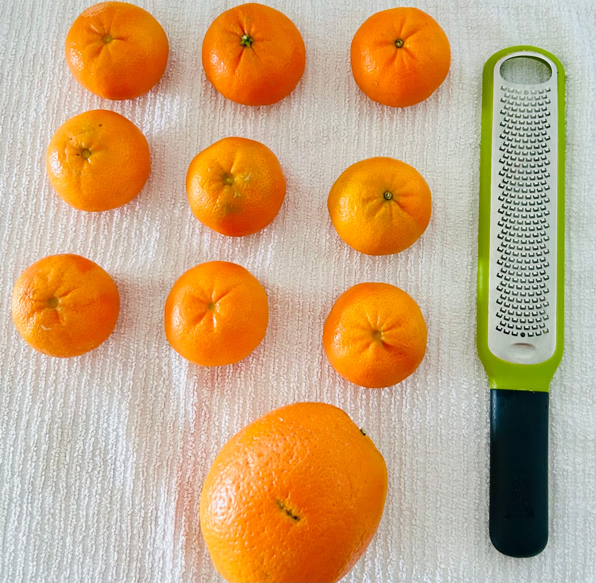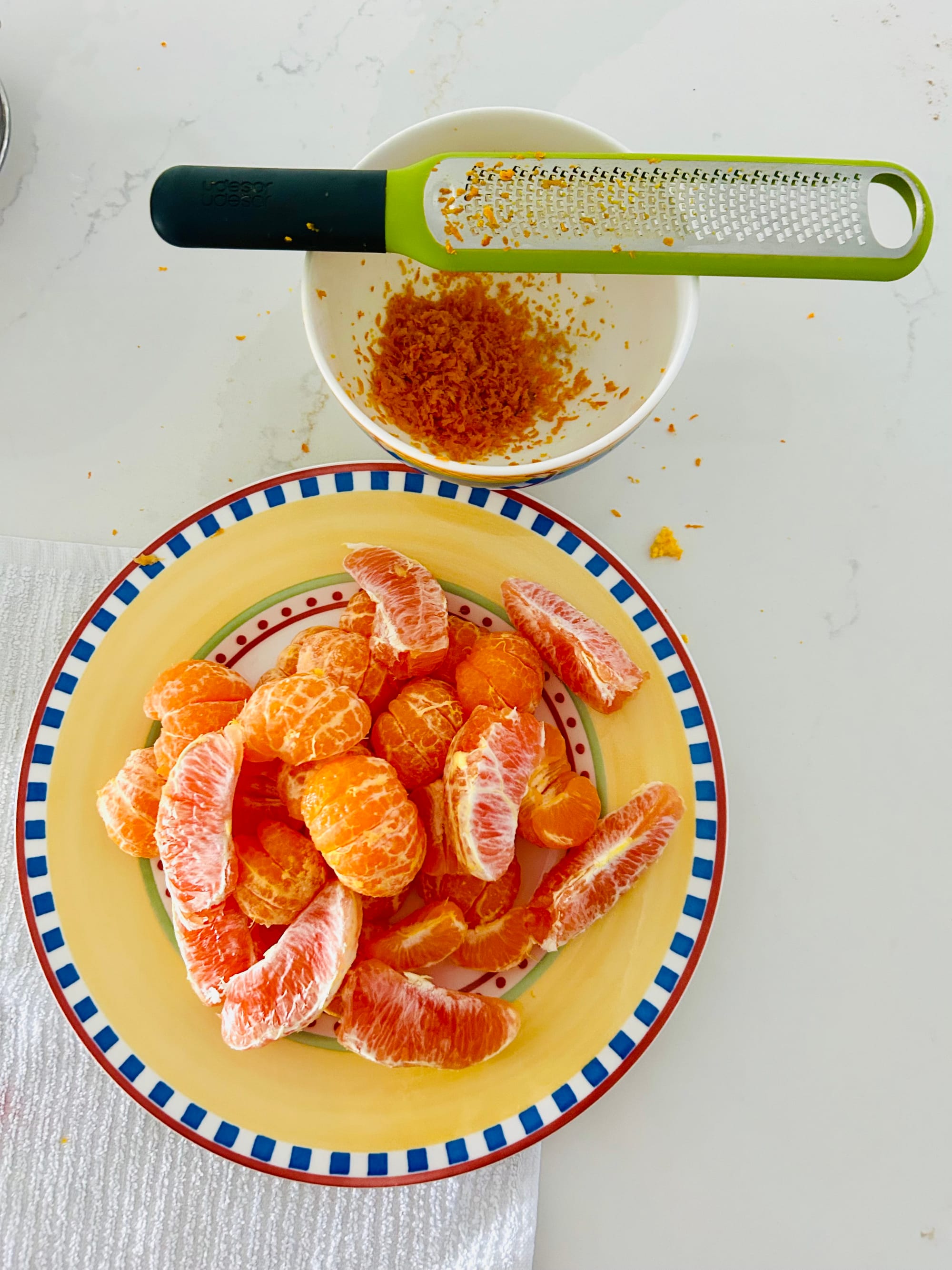 - Wash and dry all tangerines and zest (remember, only zest top orange part, don’t go deep to white pith).