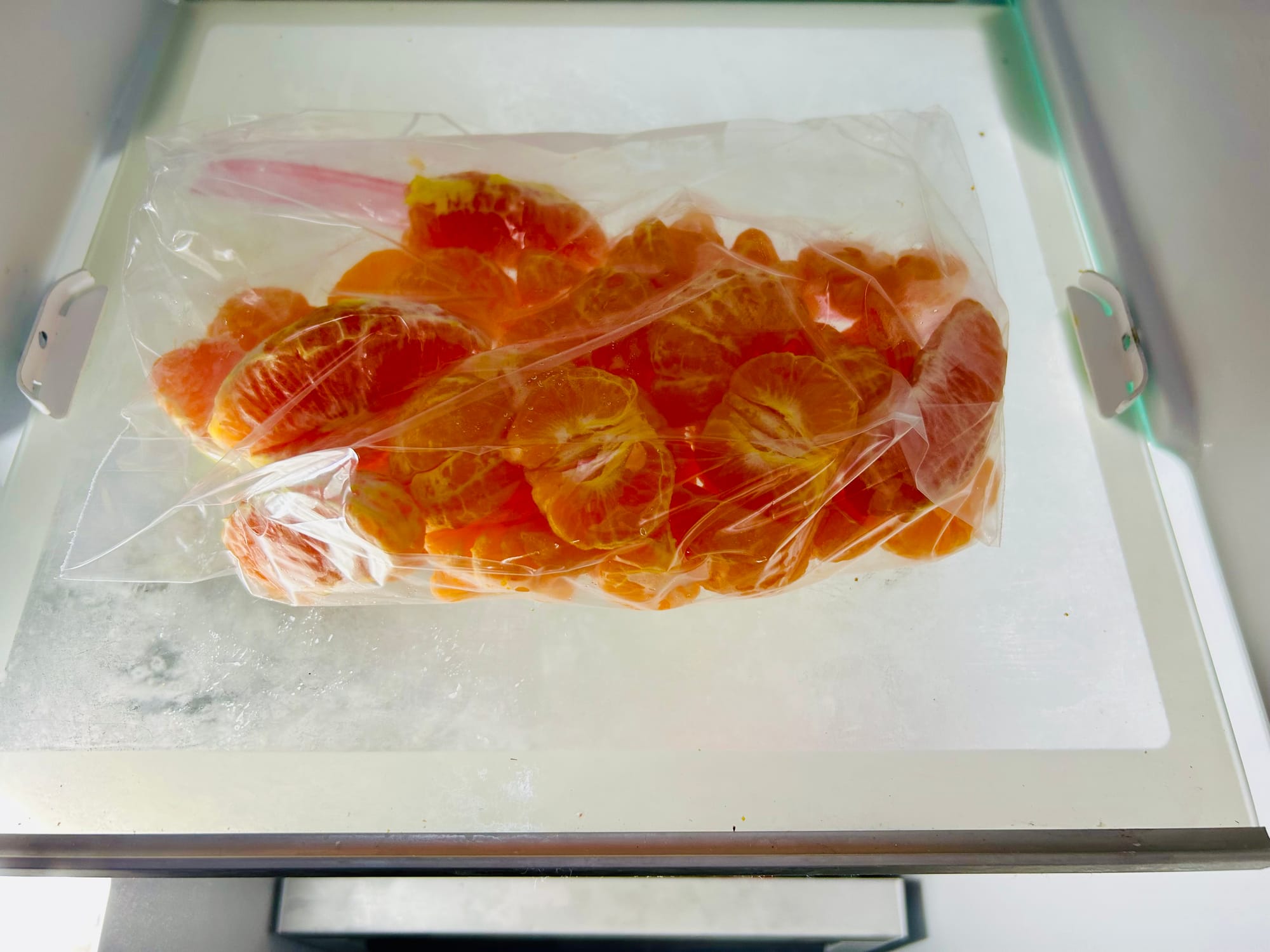 - Place all tangerine pieces and zest in a large ziplock bag and freeze for about 2 hours, until a little frozen.
