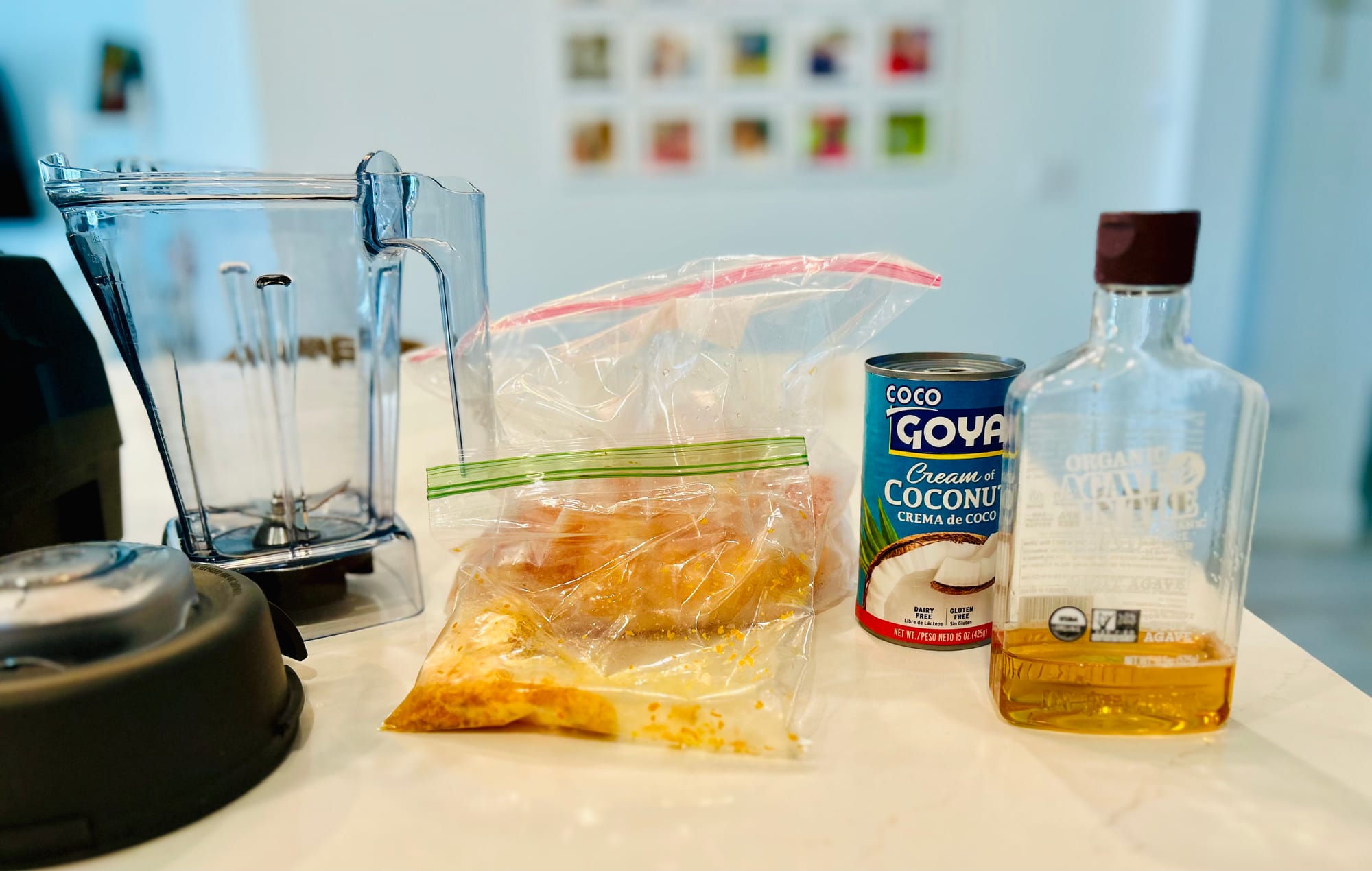 - Remove bag from freezer. Place in blender coconut cream, agave syrup, fruit and zest (i like to load blender, liquids first, followed by more dense ingredients, so as to make it easier on the blending process for the motor. Blend until smooth. Sample to see if mixture is sweet enough for you. if not, add an extra teaspoon or so of agave.