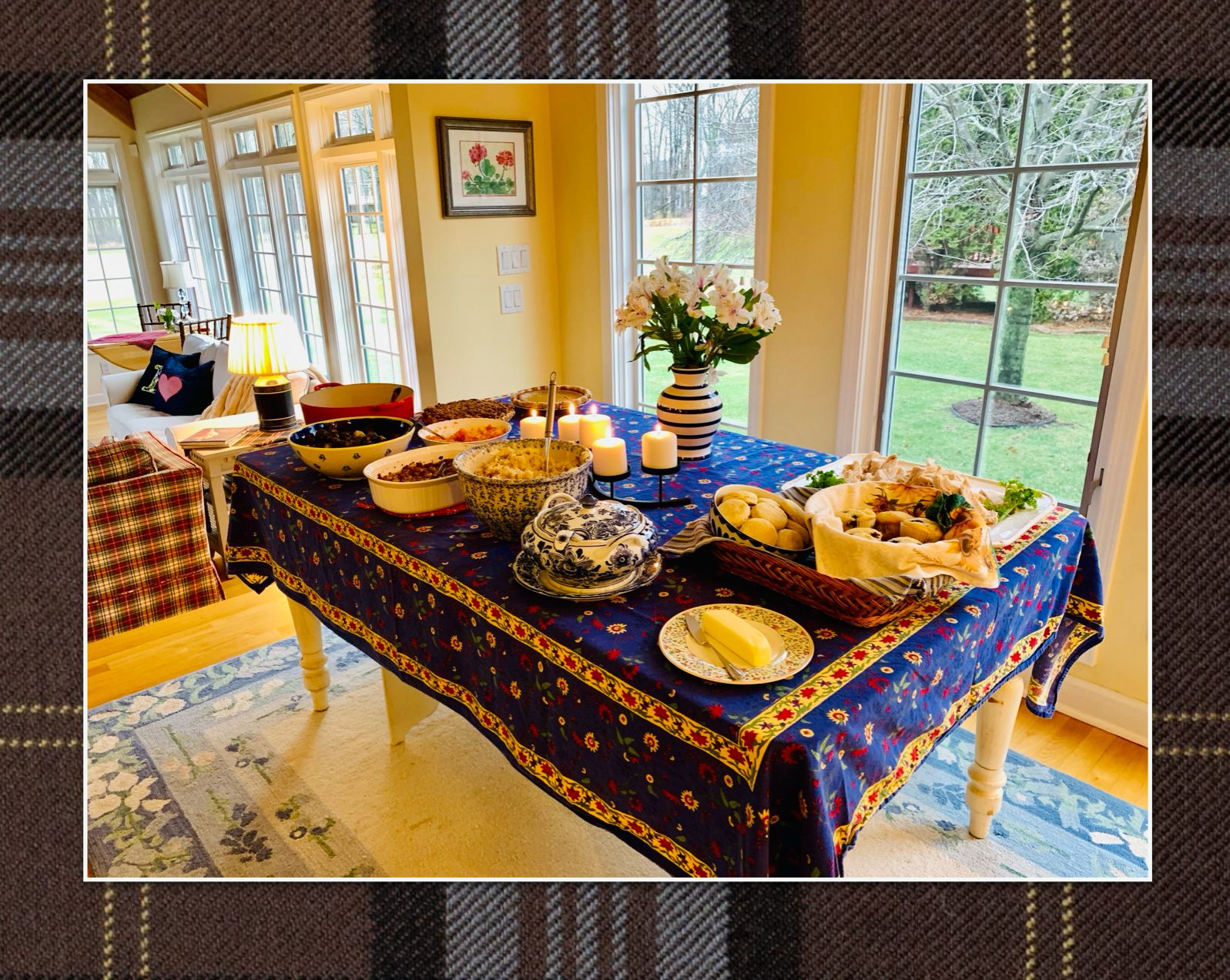 - Decide on how you will arrange the food and the dining table. Will the food be on the island, the kitchen table or on the dining table? For a larger group, most likely on a separate table or the island. For a smaller group, the dining table may just work. I like to draw a diagram of the serving table if all sides/entree’ will be there. The night before or the morning of, I place all serving dishes in place with correct serving spoon/fork/tongs.