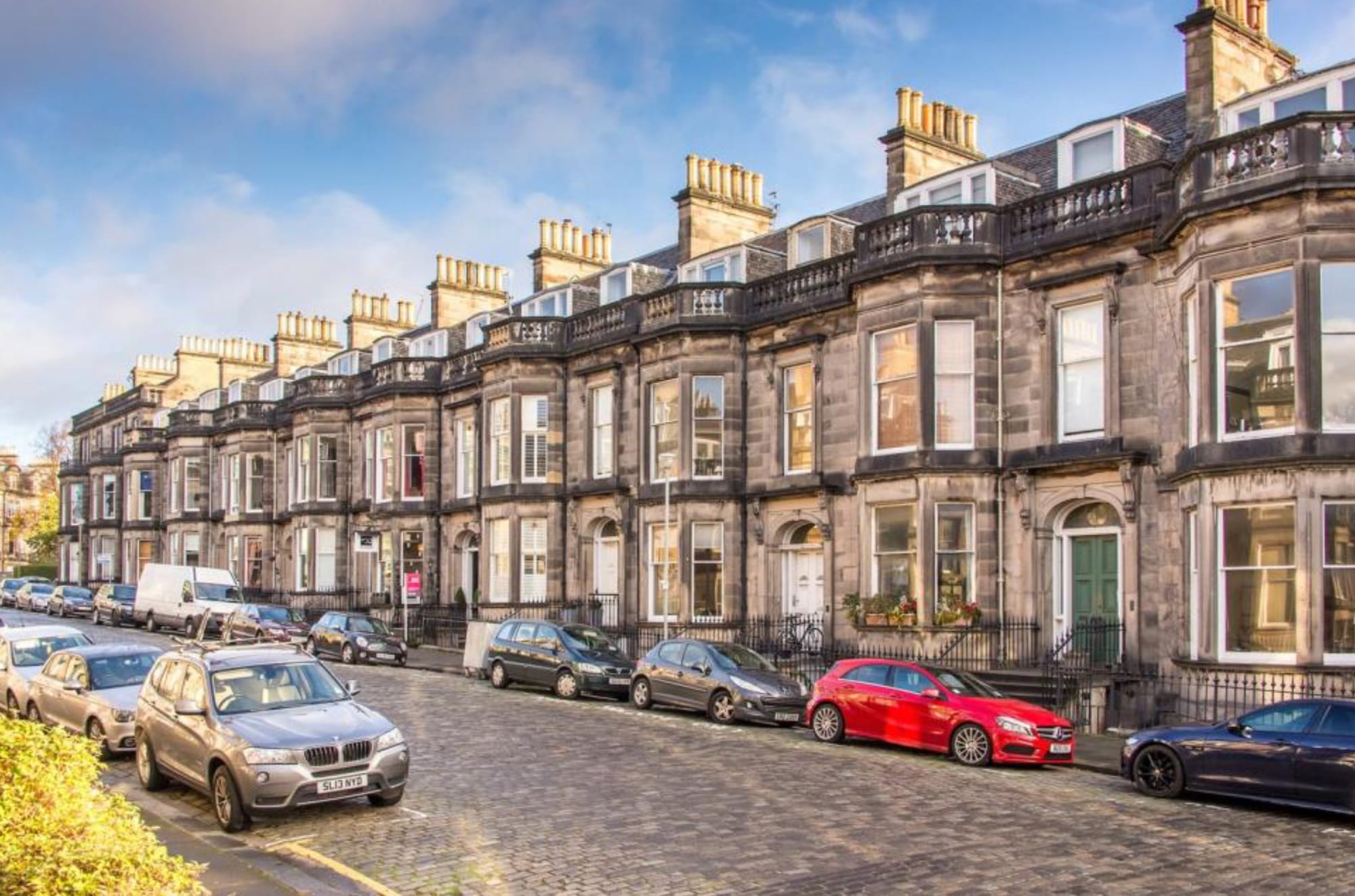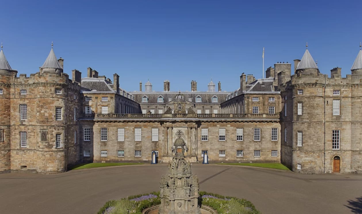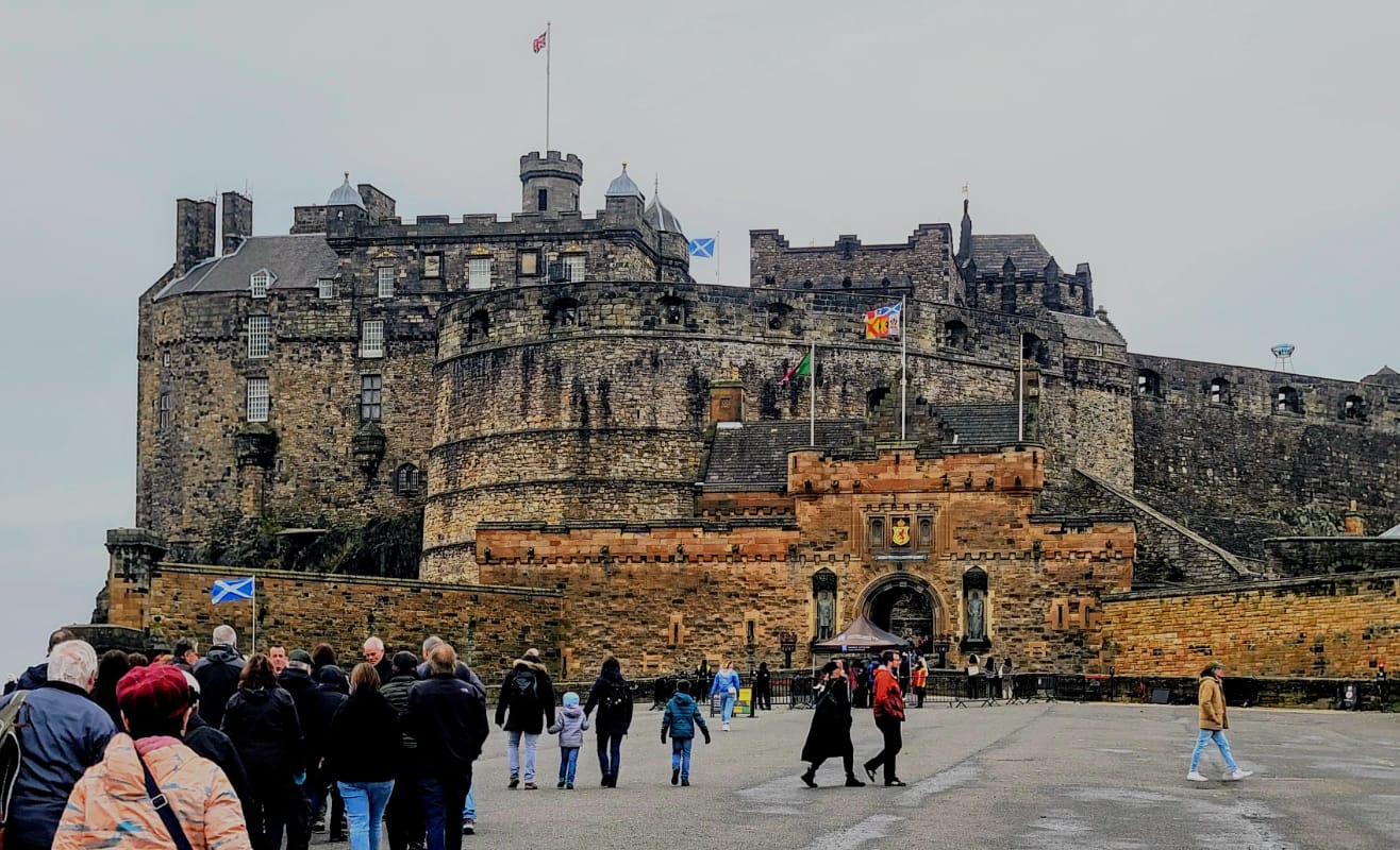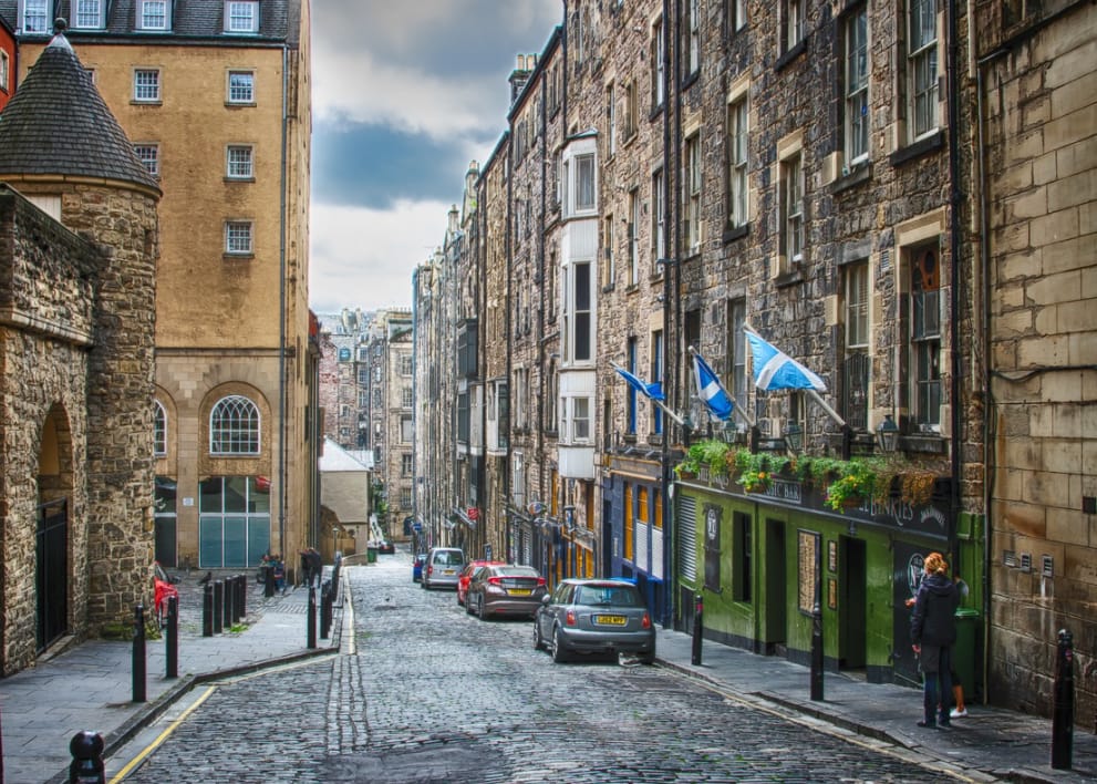 Top left, the Coats Gardens area of Edinburgh, Scotland. Top right, a street in downtown Edinburgh, bottom left the Castle at Edinburgh at the top of the hill and bottom right the Palace at Edinburgh-Hollyroodhouse, at the bottom of the hill.