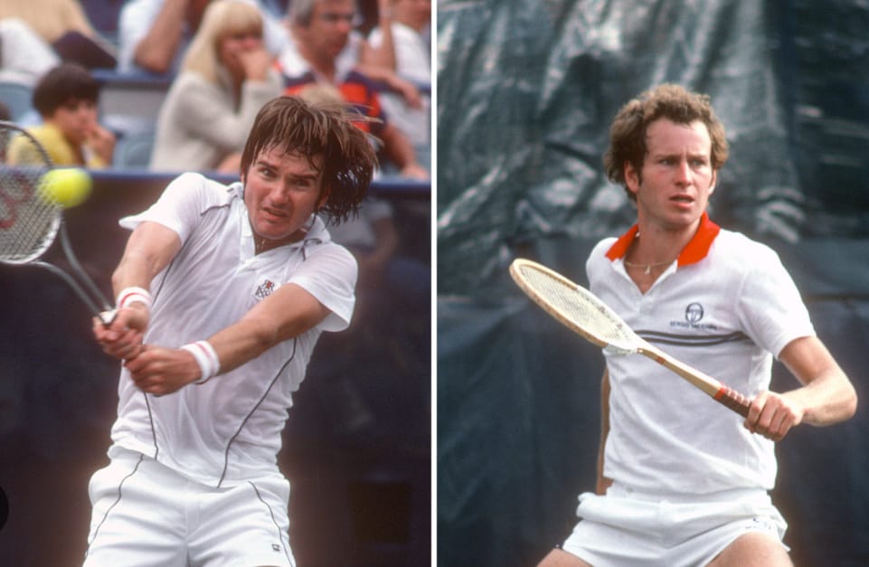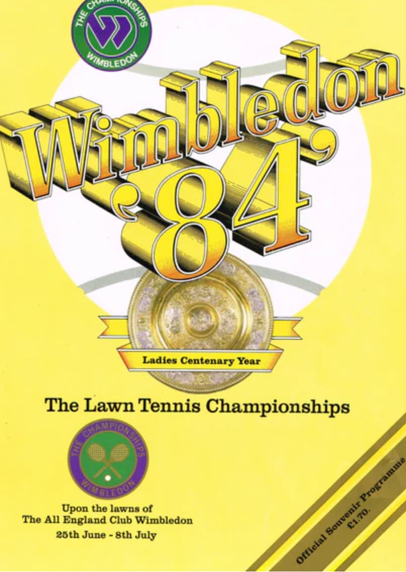 The poster for Wimbledon 1984 and the two men in the finals, Americans, Jimmy Connors and John McEnroe.