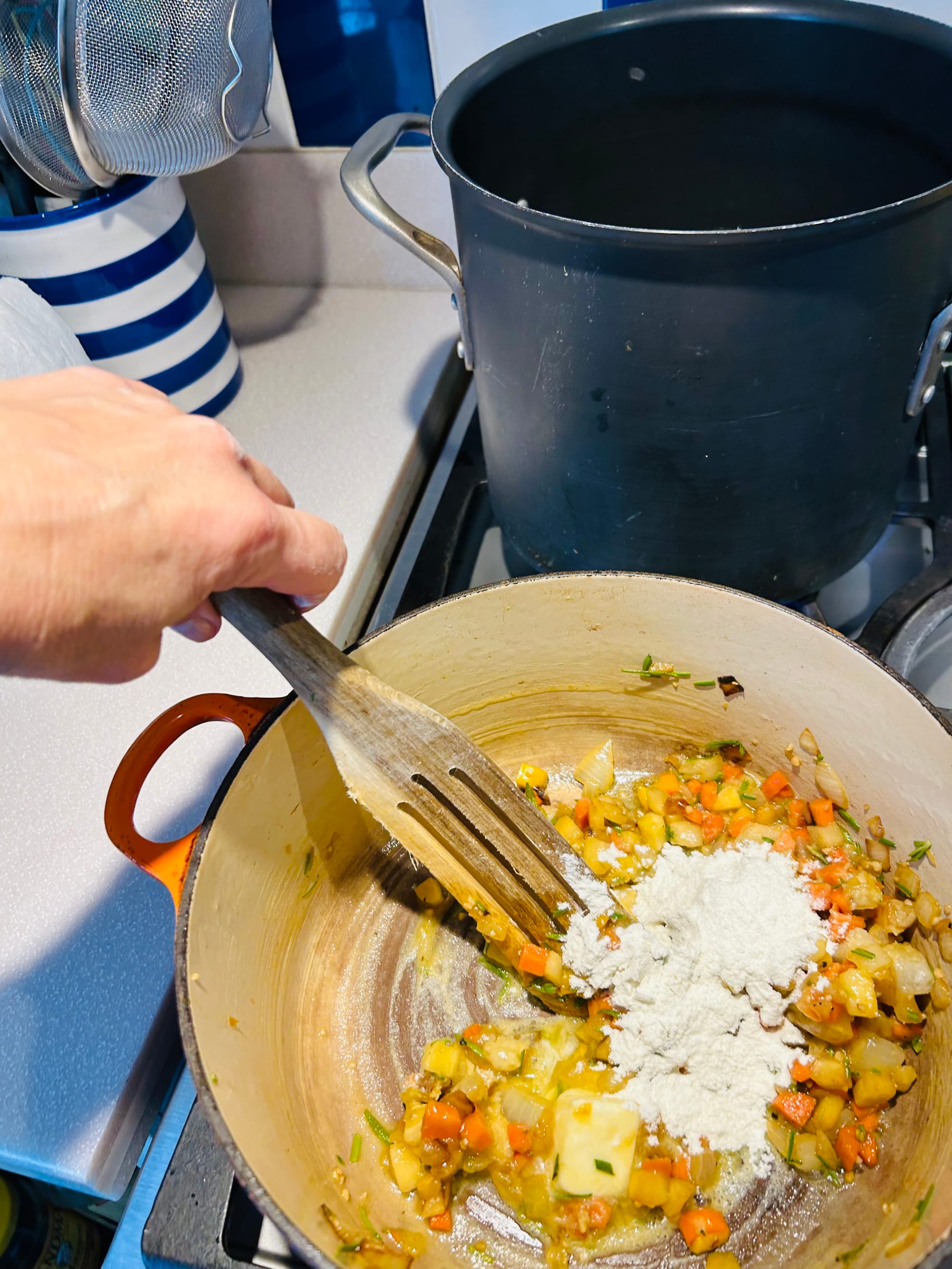 5. Here is where the ‘magic is made’ when you make a roux or start the thickening of the stew. Add the remaining unsalted butter, let it melt into the vegetables. Start adding the flour, a little at a time, stirring into the vegetables, Rosemary with either a whisk (a silicon one if you are using a LeCreuset, so as not to scratch the surface) or your preferred kitchen utensils for this purpose.