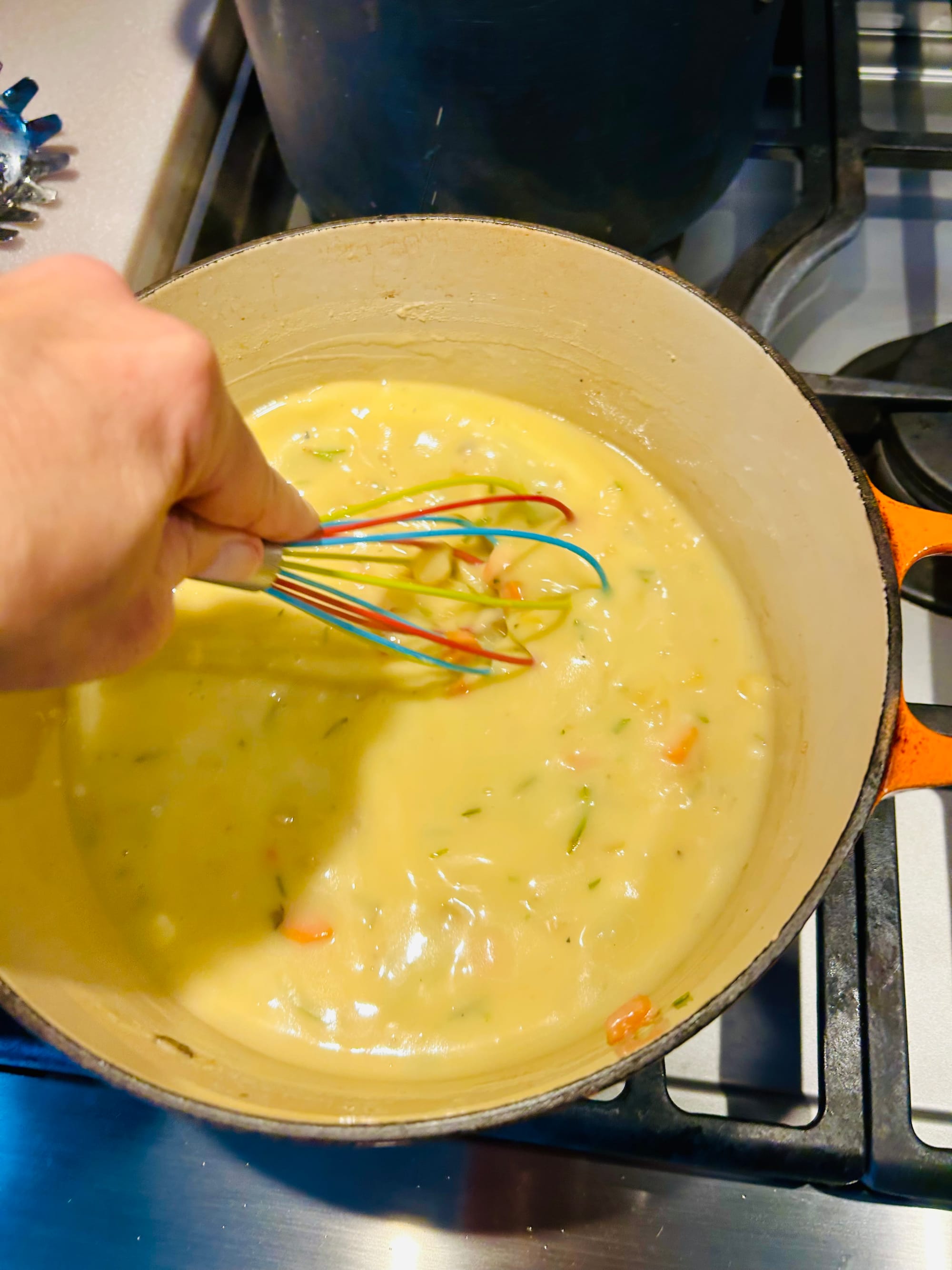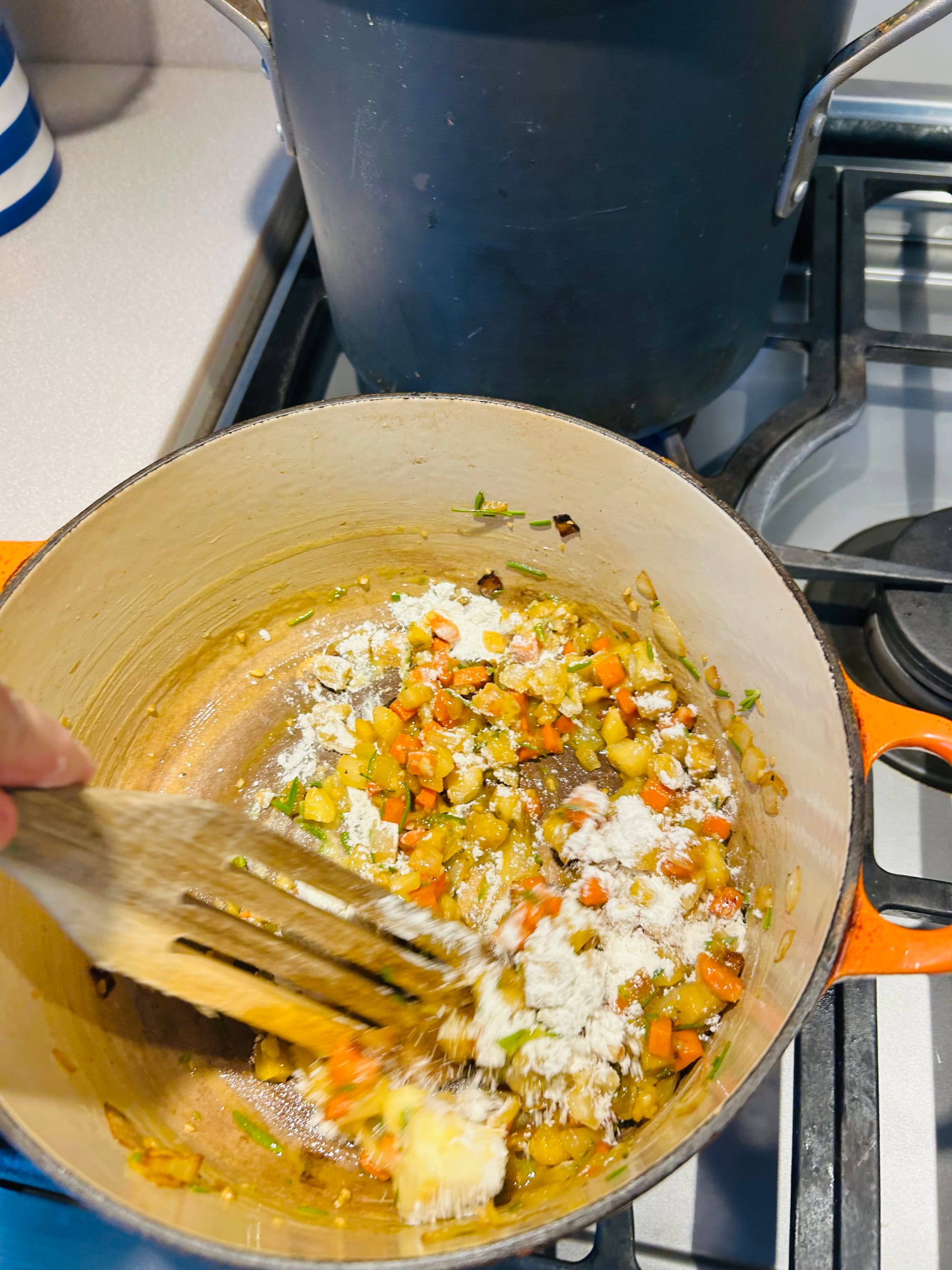 6. Your mixture will begin to thicken, add a little stock, incorporate it into the vegetables to thin it, then add a little more flour, whisk/ stir, sort of scrapping the bowl with the silicon whisk so as not to have mixture stick or burn. You will adjust the heat accordingly so as not to over heat. Keep doing this until you have a nice thick ‘stew like’ consistency.
