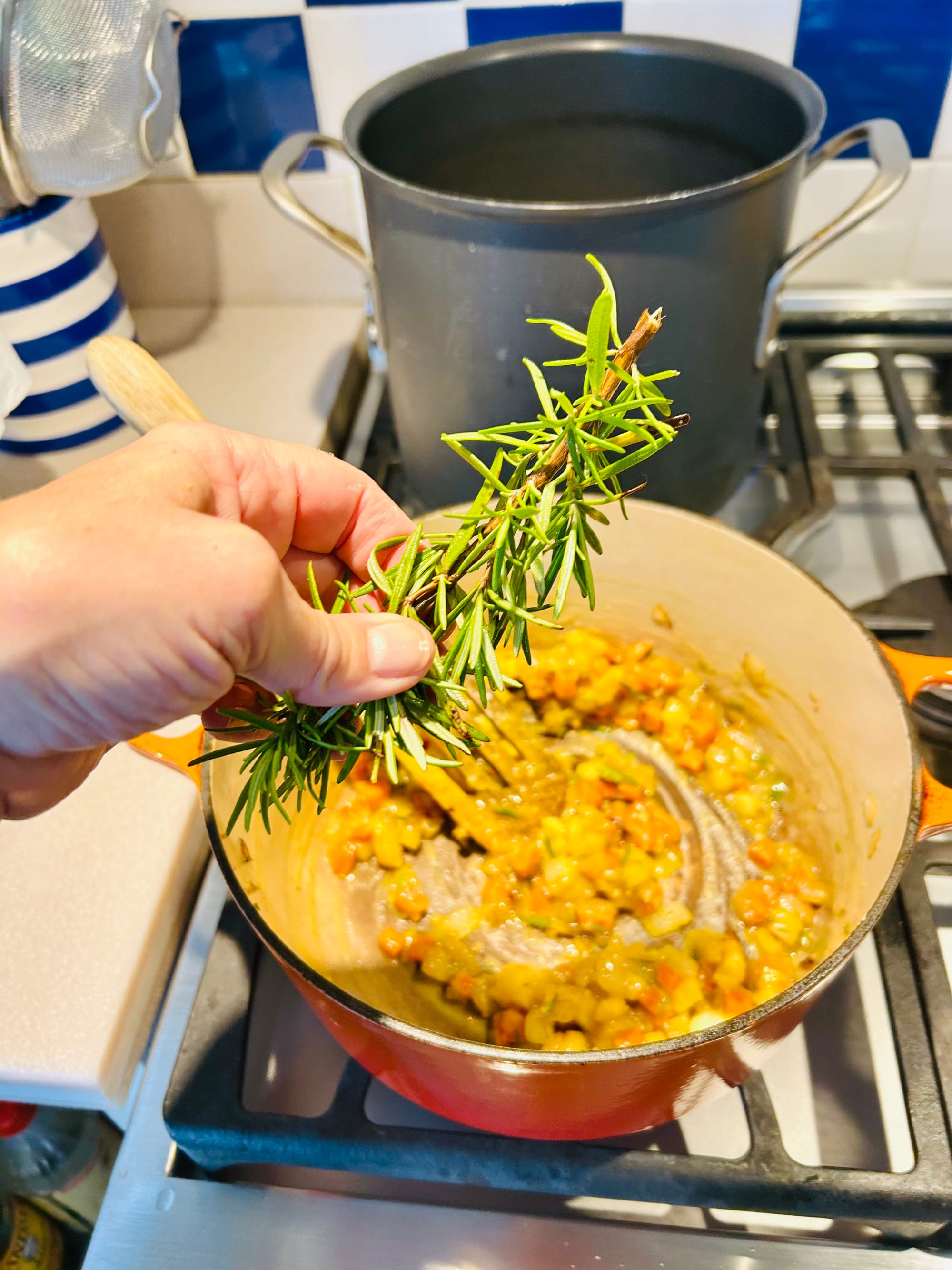 4. Add the carrots & celery. When they are soft, about 4 minutes, add the Rosemary. Saute’ about 1 minute. Add garlic, saute’ another minute.