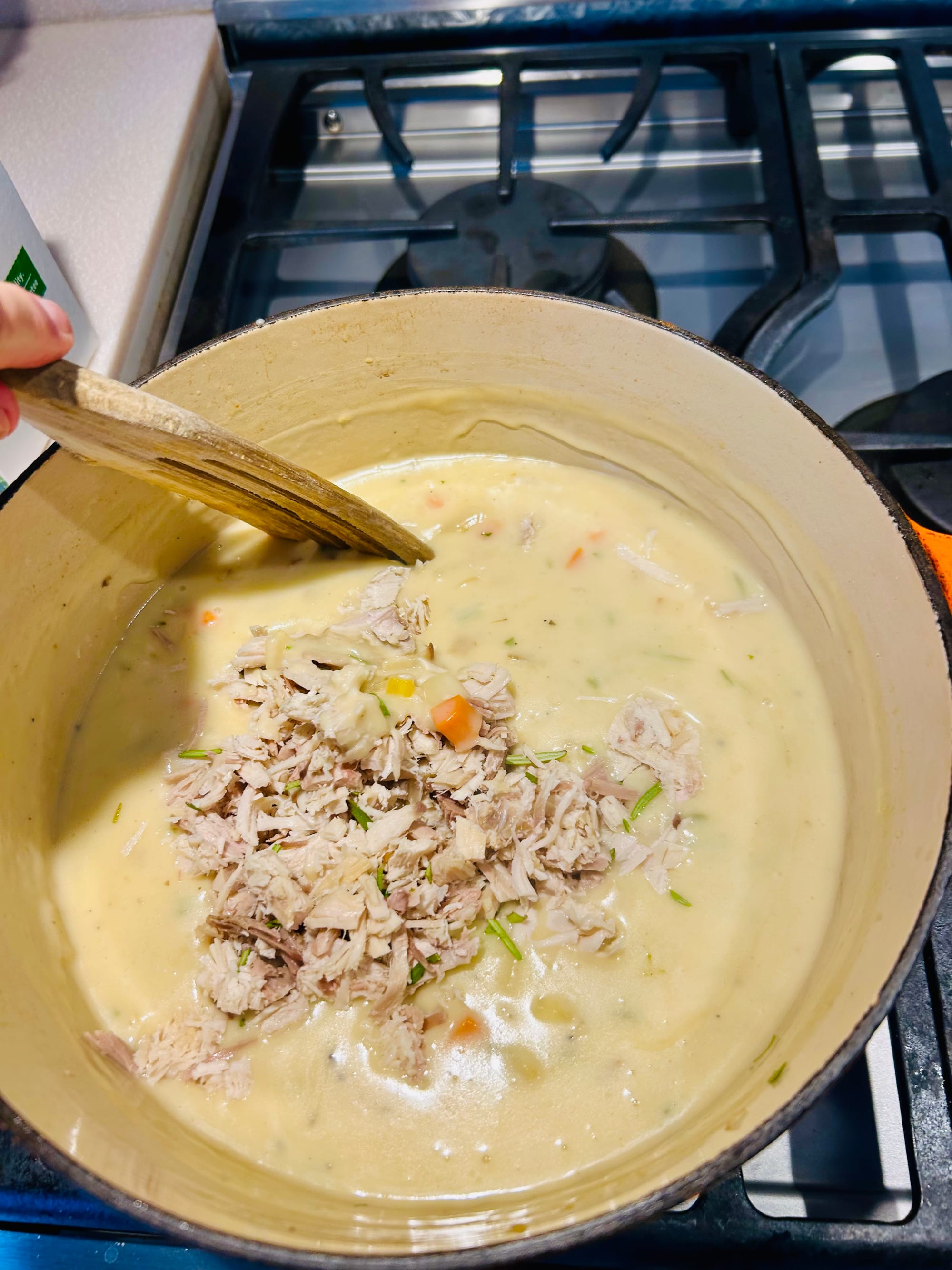 7. Now, turn heat down very low, slowly pour in the milk, a little at a time, until the stew is the consistency you are happy with. Add the turkey, stir and then add the cooked noodles. (Do not let mixture boil as milk may curdle, keep heat very low.