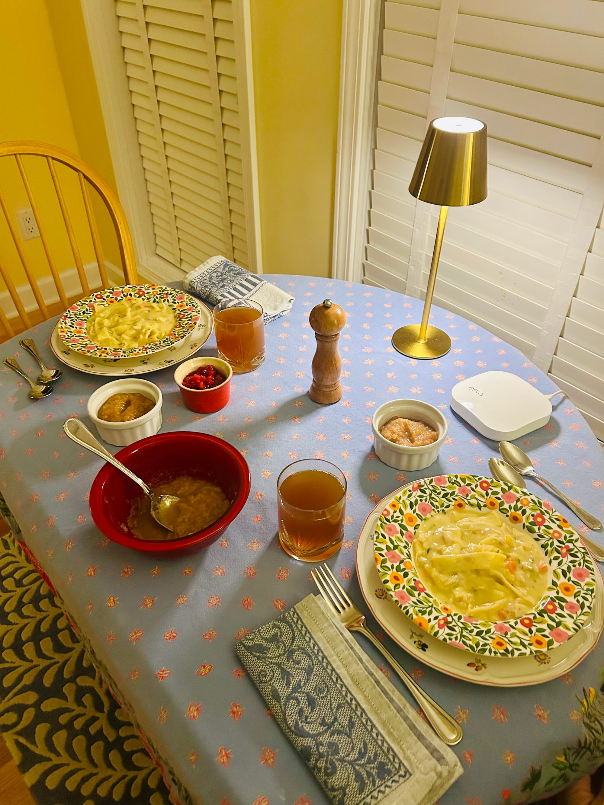Last weekend, we had a family dinner and the menu was your usually Thanksgiving menu, as in turkey, mashed potatoes (store bought, I can’t do better than Bob), dressing, sweet potatoes, homemade bread, Brussels sprouts, salad, pumpkin pie apple pie, both served with whipped cream. I had some help, I did not make everything. I sent home leftovers and there were still a few for us for a couple meals following. Pretty much the only thing left was about 2 cups of turkey. What to do? A couple weeks ago, I had a ‘hankering’ for a creamy chicken noodle stew. That delicious dish came to mind and with no recipe (same as a couple of weeks ago), I decided to make the same with the left over turkey. I made this in the mid afternoon, let it cool, refrigerated it and then warmed it up on the stove that evening. One more thing. I still had some rosemary in a pot on the patio. Normally, I would have used fresh parsley, however, not having any on hand and I wanted some more green in the stew. Wow, what a good decision. It gave the stew a ‘French Provençal flavor.’ Next time when I make it, I will add 1/2 cup of a dry French white after the vegetables have saute’ d. Just a thought. I served this with applesauce from the Thanksgiving dinner. you could serve with your remaining left- over side dishes. Here you go…