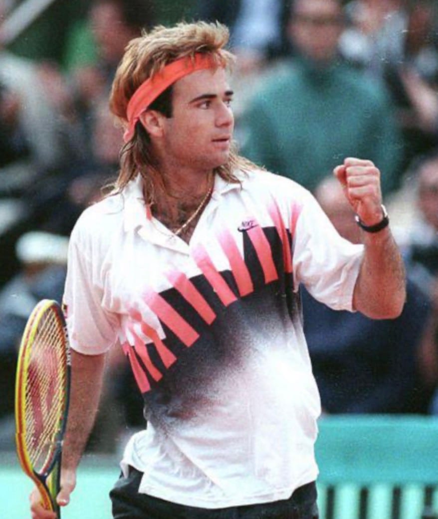 Andre Agassi with his wife Steffi and their children, Jaz and Jaden. Far right photo Andre in his early days as a professional tennis player.
